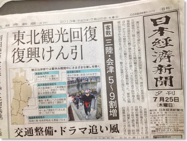 一方で、日本経済新聞の夕刊(大阪:2013/07/25)に「東北観光回復:復興けん引<客数三陸・会津5割〜9割増>」という記事が掲載されました。これからが夏の旅行シーズン本番ですが、もう既に多くの人々が訪れていて、この記事の読者は、なんとなくもう復興が本格的になっていて、個人レベルでは無理に支援を行わなくても良いのでは…という印象を持ってしまうかもしれません。しかしながら、先の坂元小学校のように、公表された情報だけでは、本当にわからない部分がありますし、言うまでも無く、観光客が増加しただけでは、例えば子どもの心の問題などはまったく解決できません。記事を読んで、ホッとした気持ちになれることは、本当は嬉しいことではありますが、そこで思考停止に陥れば、まだまだ支援を必要としている人々への配慮を忘れることとなり、更なる「風化」をもたらすことになります。上から目線で本当に恐縮ですが、ホッとしながらも、いましばらく、無理矢理に「まだまだこれからだという意識」を持ち続けてみませんか…。<(_ _)>。また、違った事実を知ることができると思います。